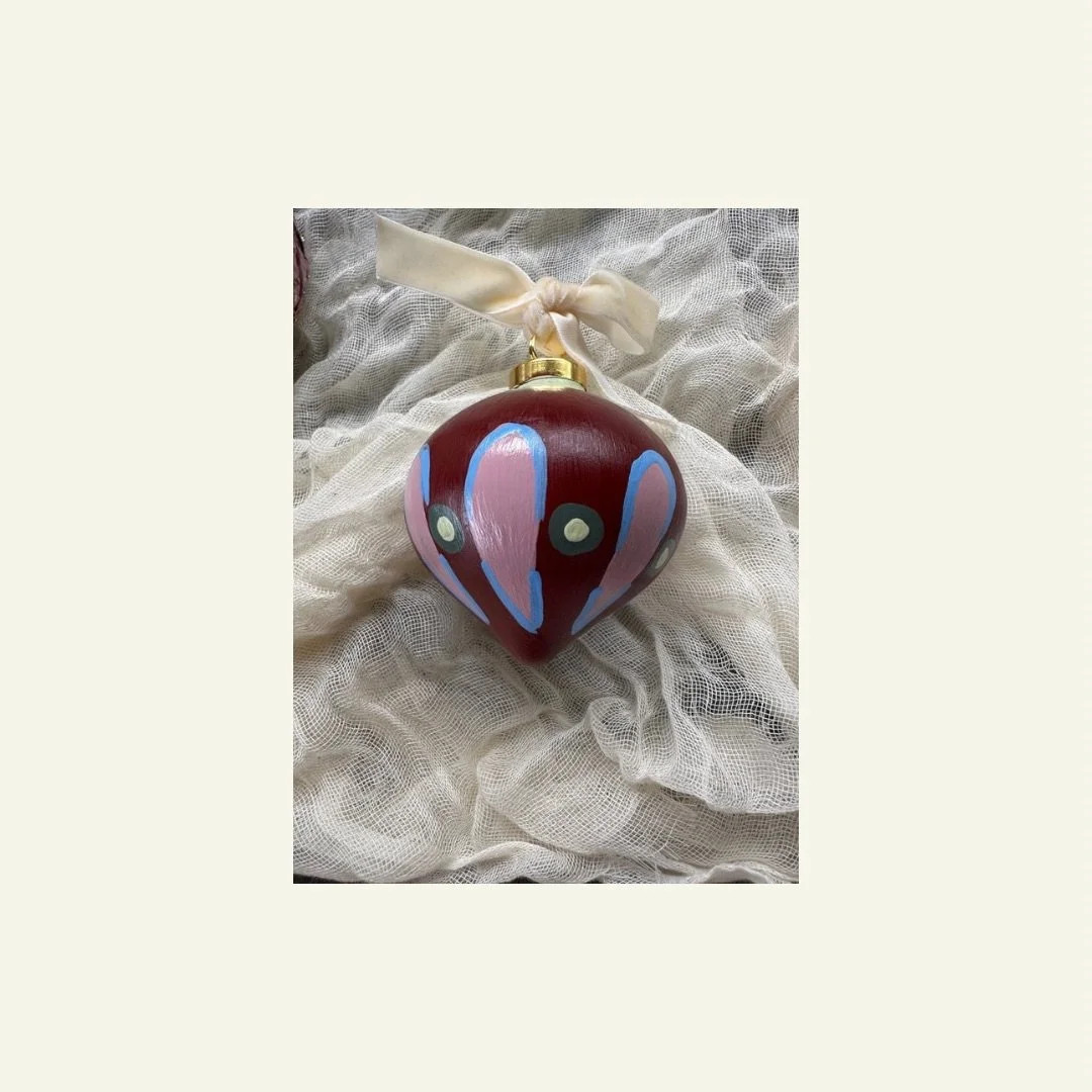 Hand-painted ceramic ornament finished with velvet ribbon and varnish.