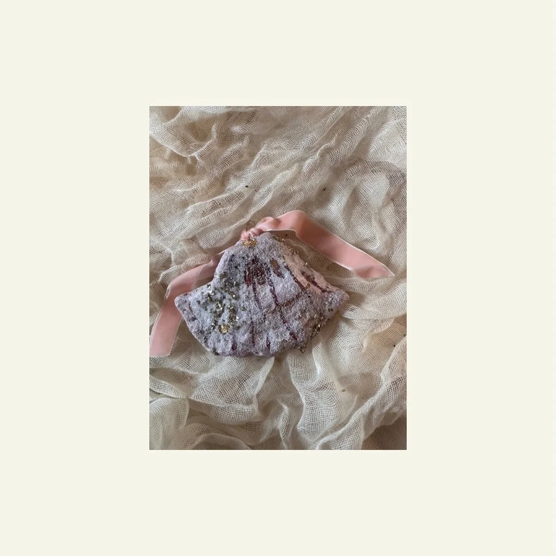 Hand constructed, painted and gilded spun cotton seashell ornament.