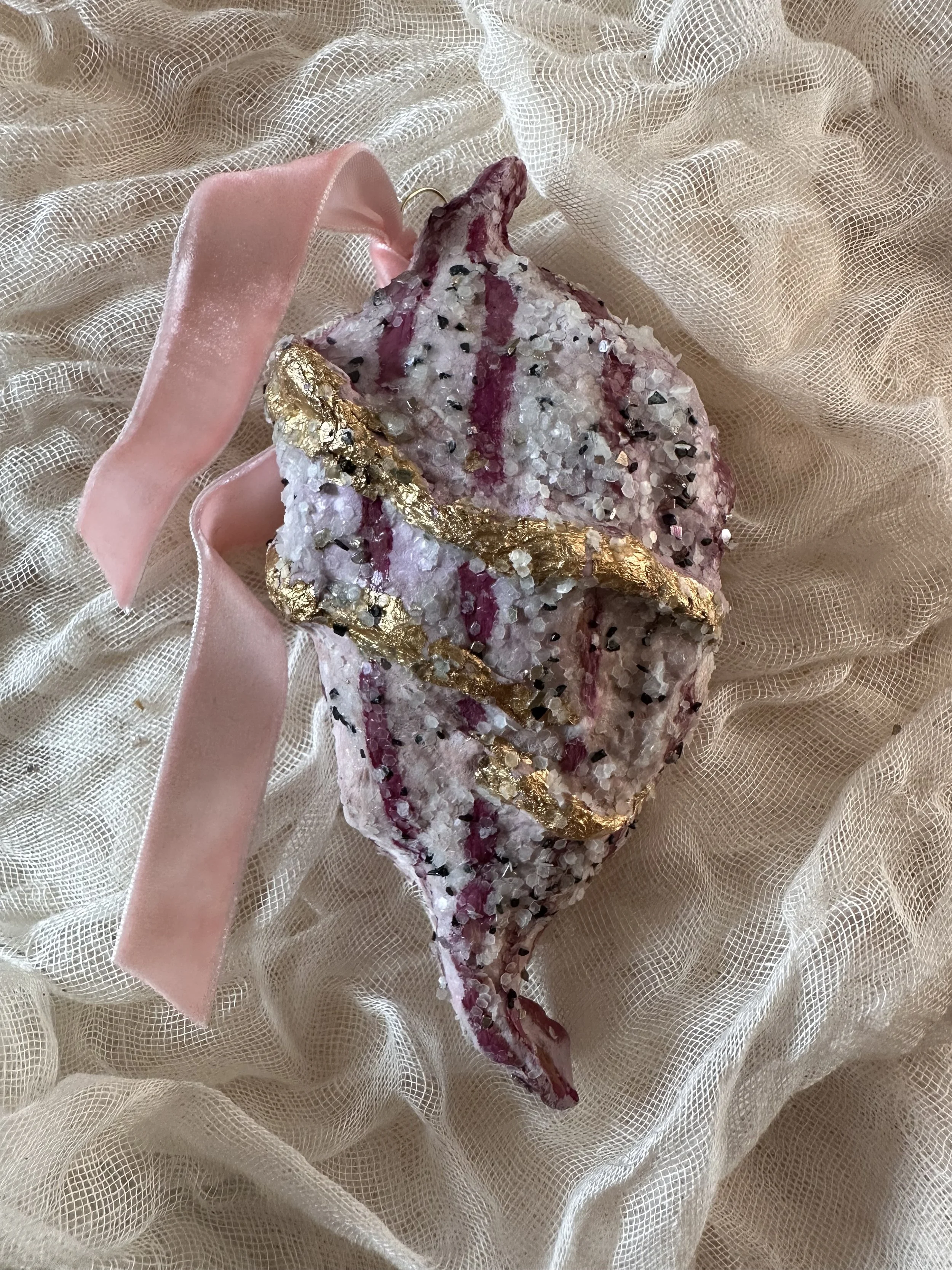 Hand constructed, painted and gilded spun cotton seashell ornament.