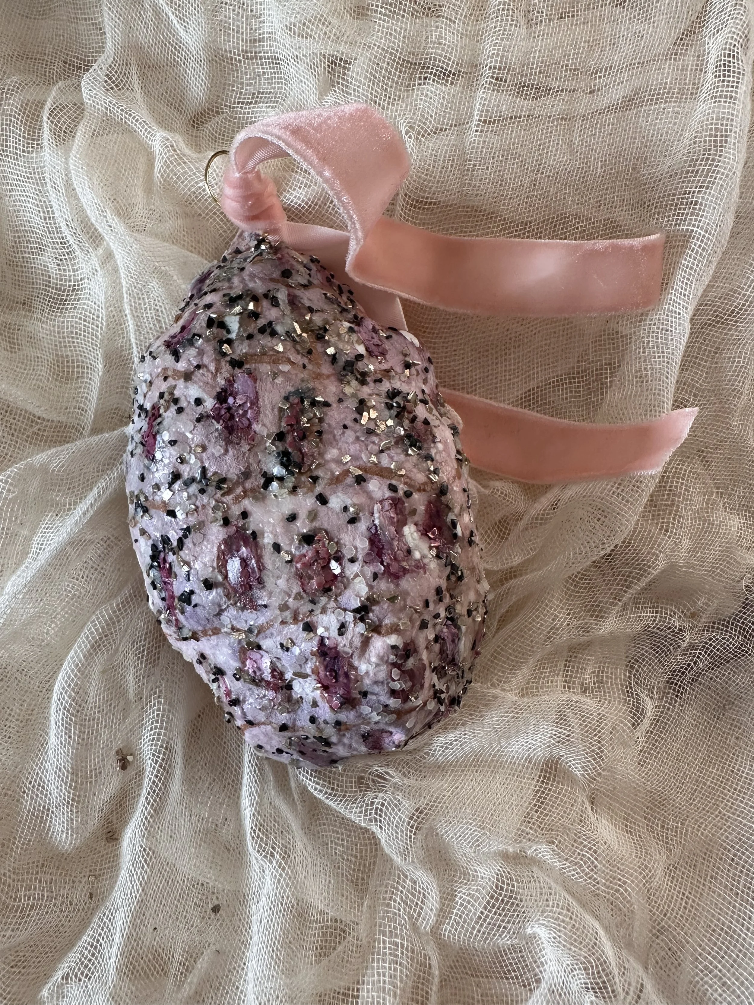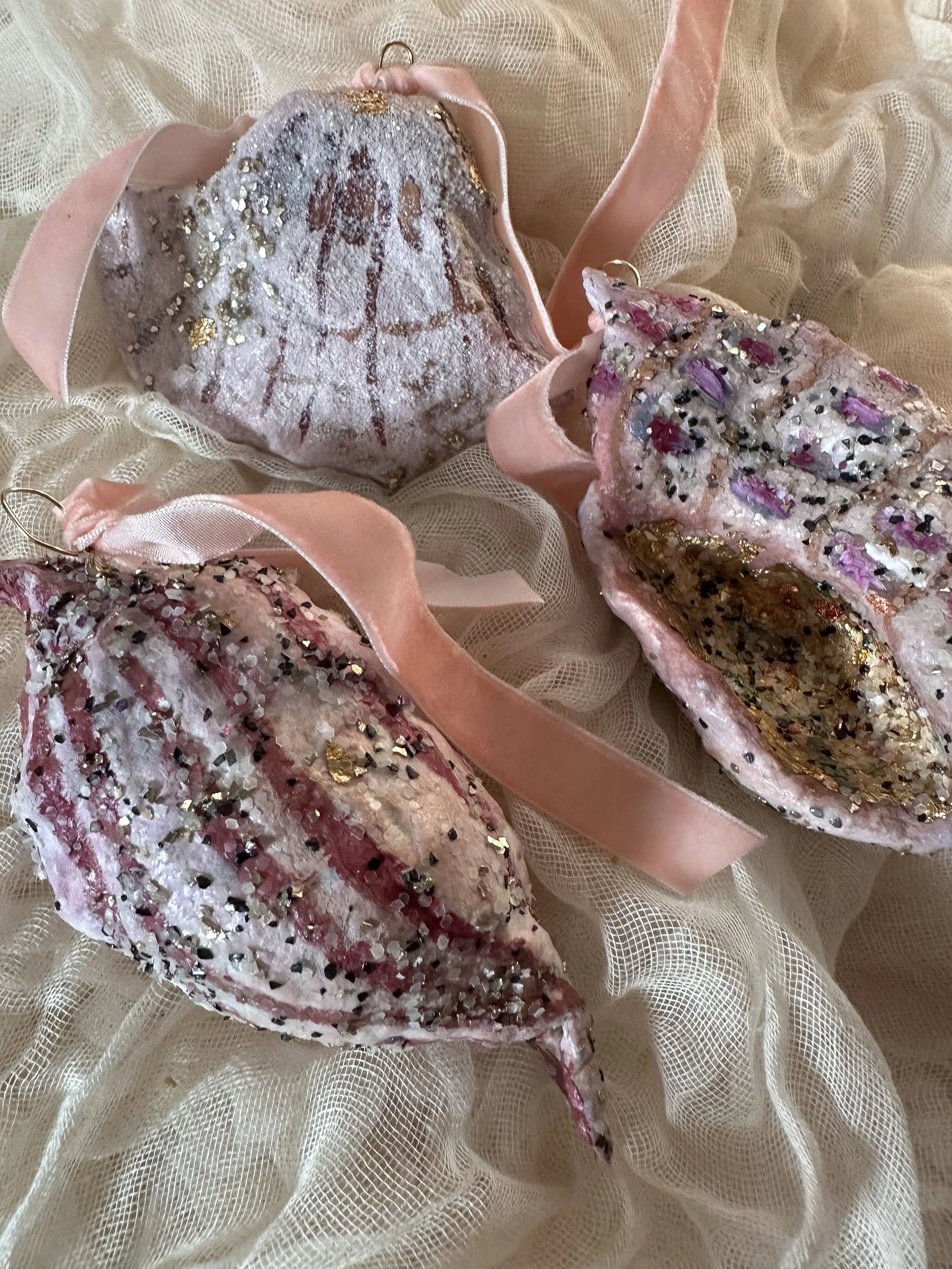 Hand constructed, painted and gilded spun cotton seashell ornament.