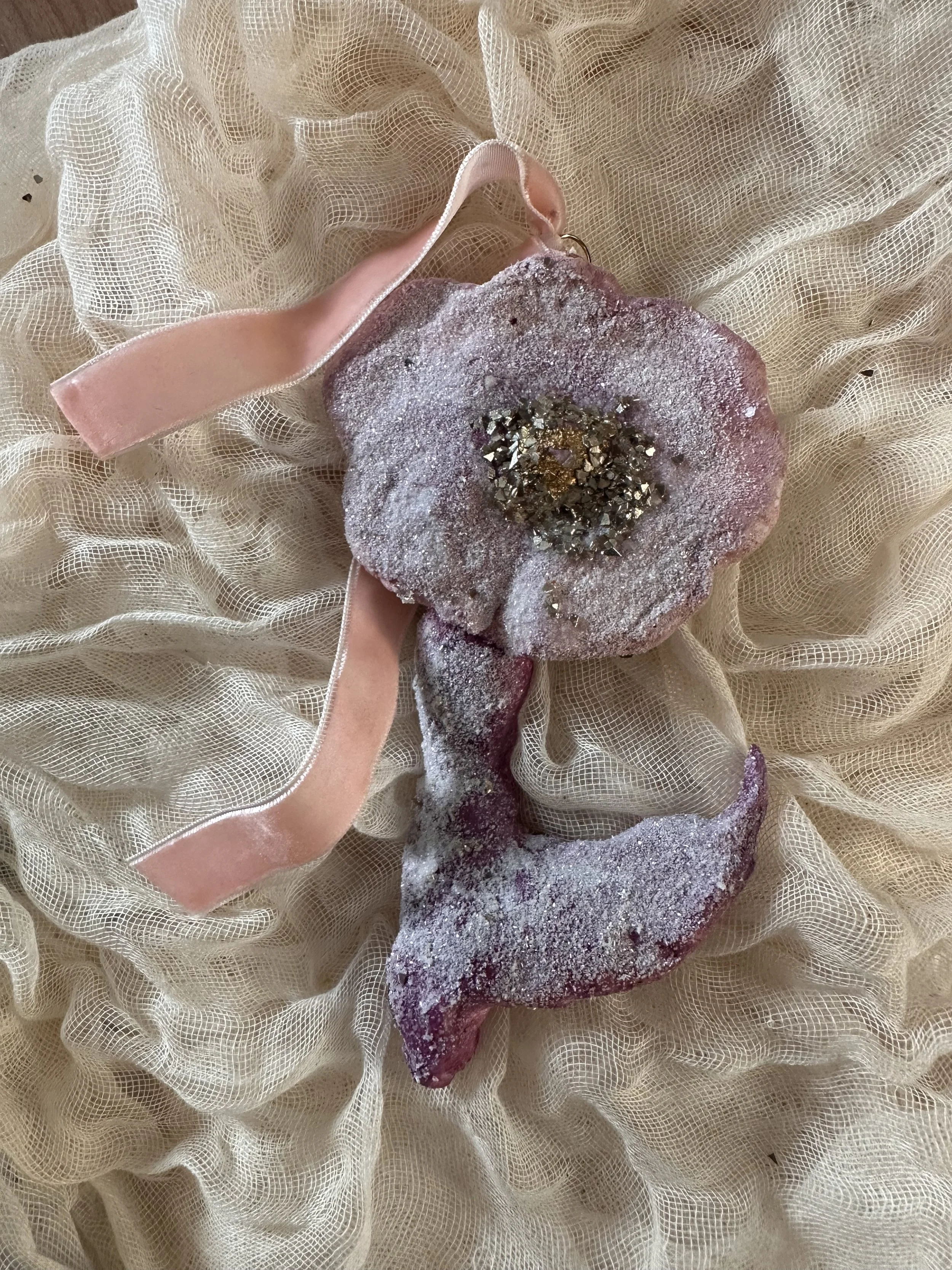 Hand constructed, painted and gilded spun cotton flower ornament.