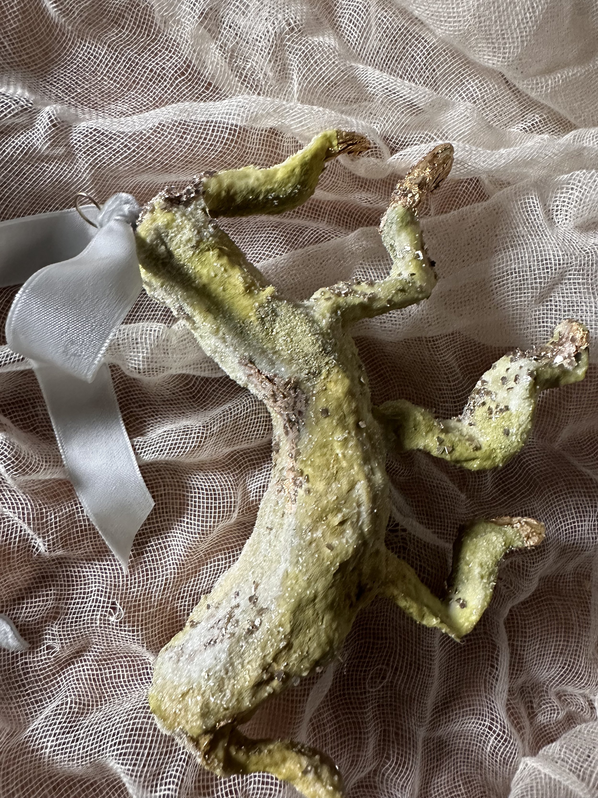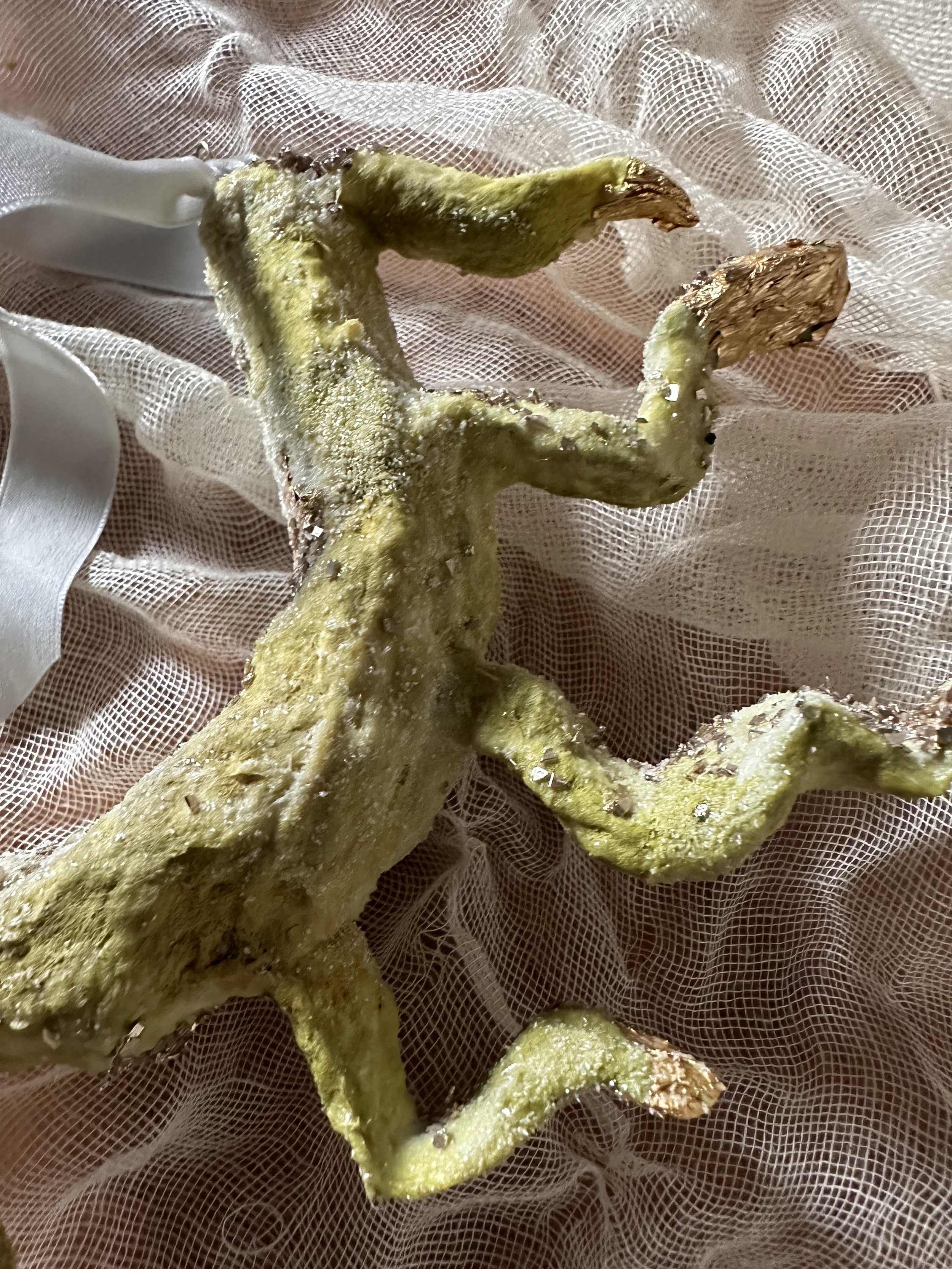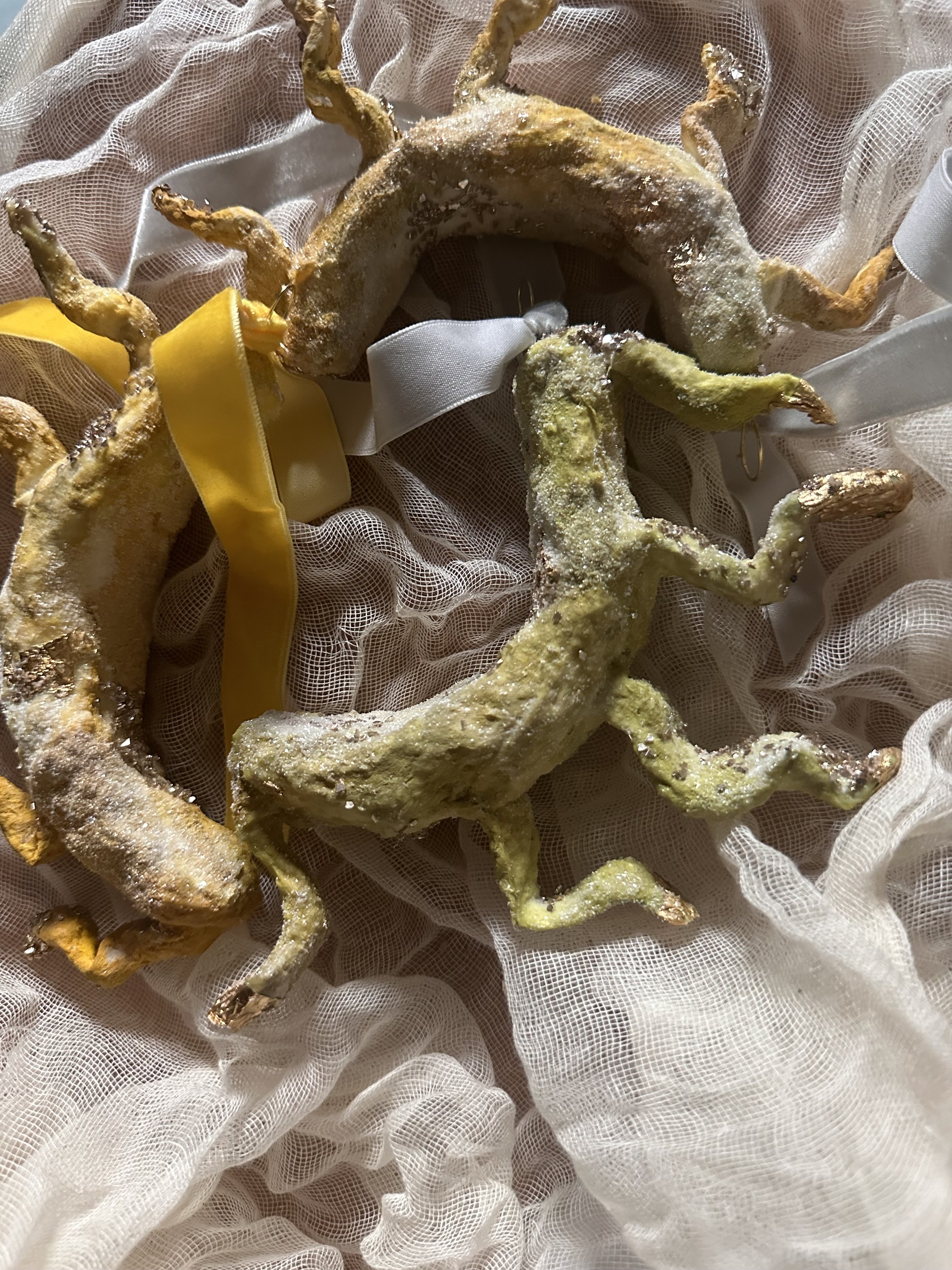 Hand constructed, painted and gilded spun cotton sun ornament.